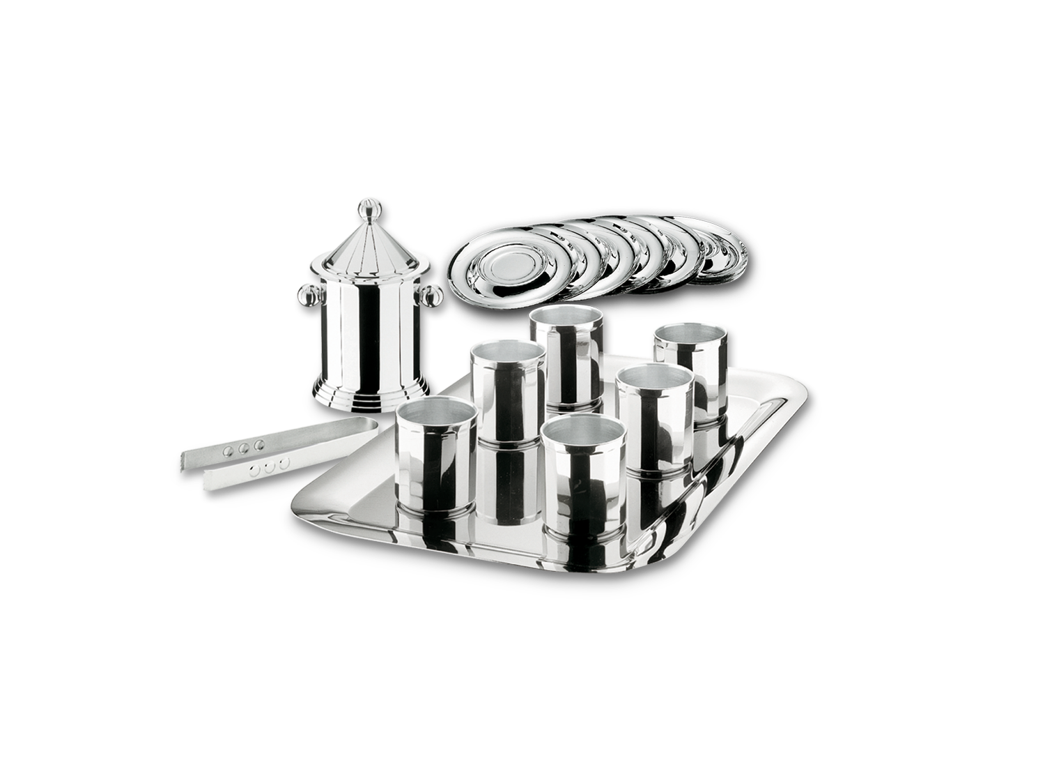*1 tray *6 whiskey glasses *6 saucers *1 ice bucket *1 ice tongs *warranty card