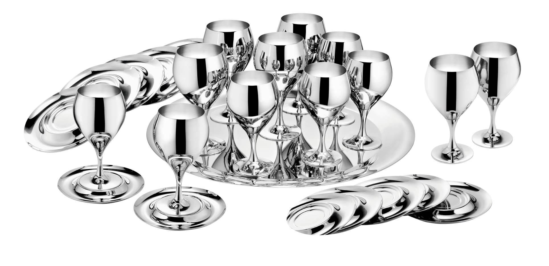 Made from indestructible stainless steel, the Prince set is a true treasure trove for generations to come. Choose PRINCE for enjoying water, wine, juices, cocktails, beer - the versatility of this set makes it eminently useful and durable. Invest in pieces of solid and weighty character: a tray, 12 saucers, 6 water glasses and 6 wine glasses, with an option to add six precious liqueur glasses. Turn every table into a luxurious setting with the PRINCE set.